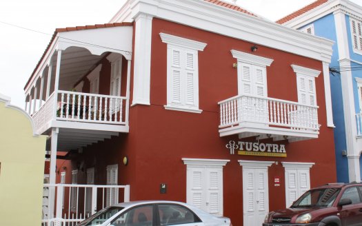 The curved Baroque façades of these twin houses are characteristic of 18th-century architecture in Curaçao. A trans
