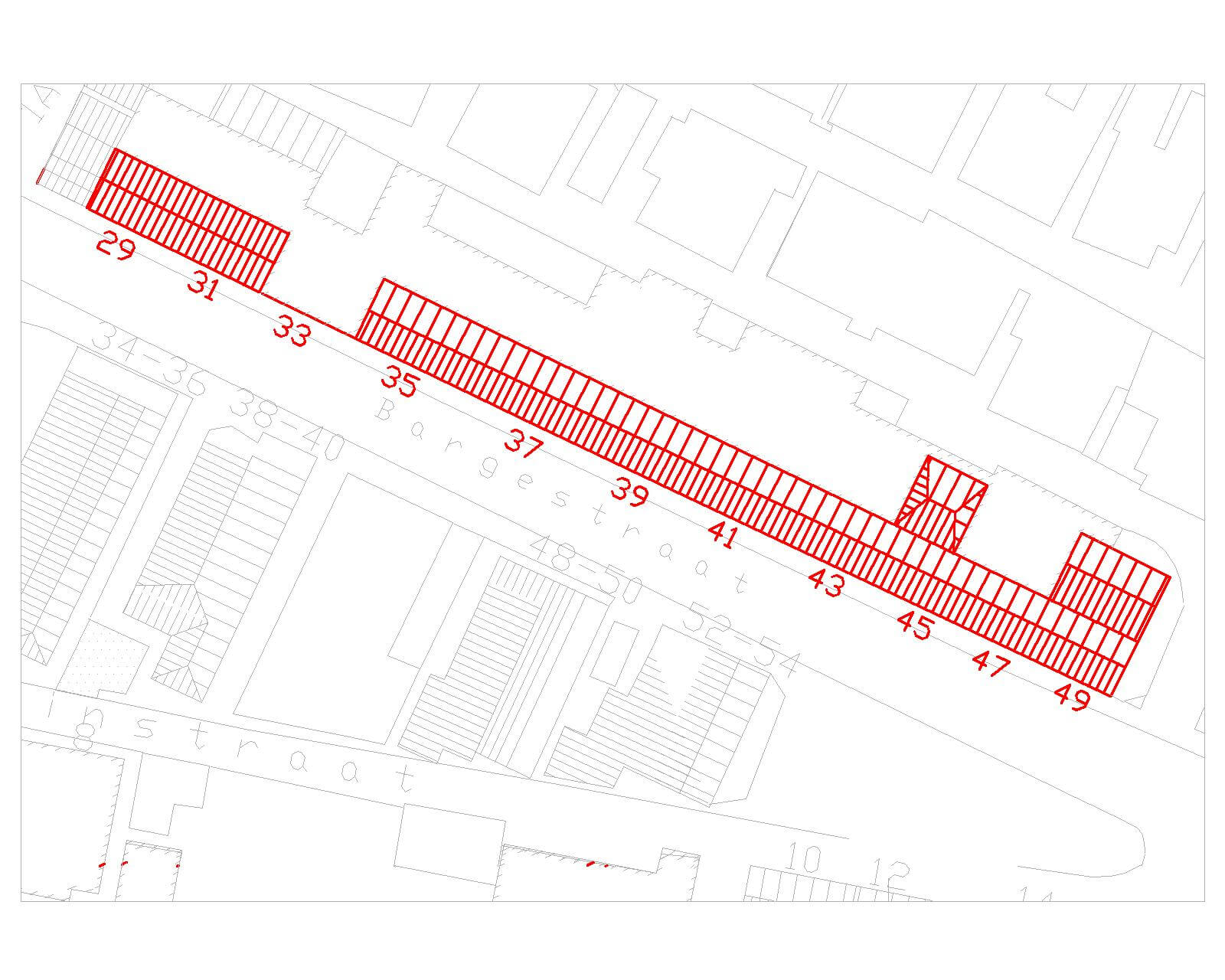 Elongated block of eleven modest one-story row houses. One continuous gable roof over the main front rooms and occasional gable roof over the back rooms. Funnel-shaped gables with 19th-century top end. Plain cornice over front façade. Shutter door and ditto flanking windows for each unit.