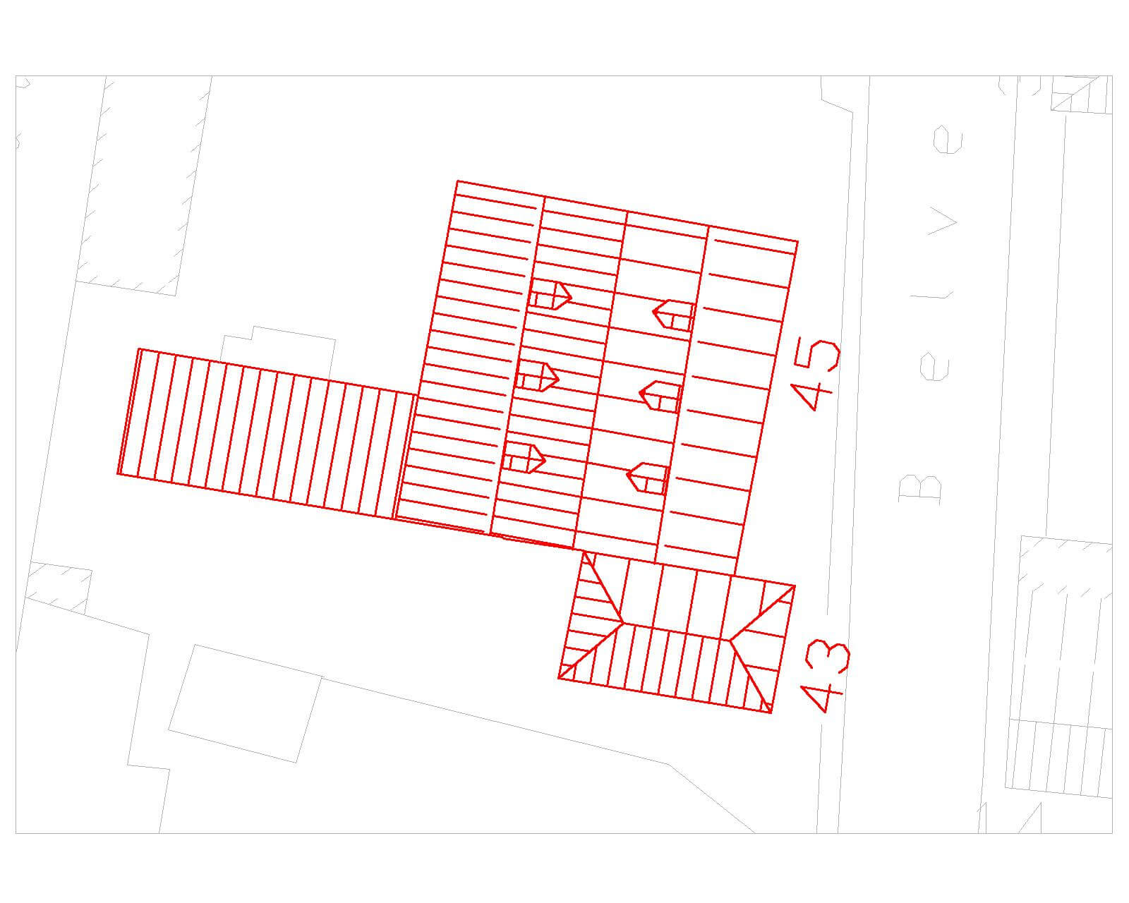 Alle daken gedekt met rode oudhollandse pannen. Op het zadeldak tweemaal drie dakkapellen met driehoekig topveld met geprofileerde deklijst en zijconsoles; De dakkapellen hebben ieder een staand venster, waarvan nog één met houten shutterramen (1).