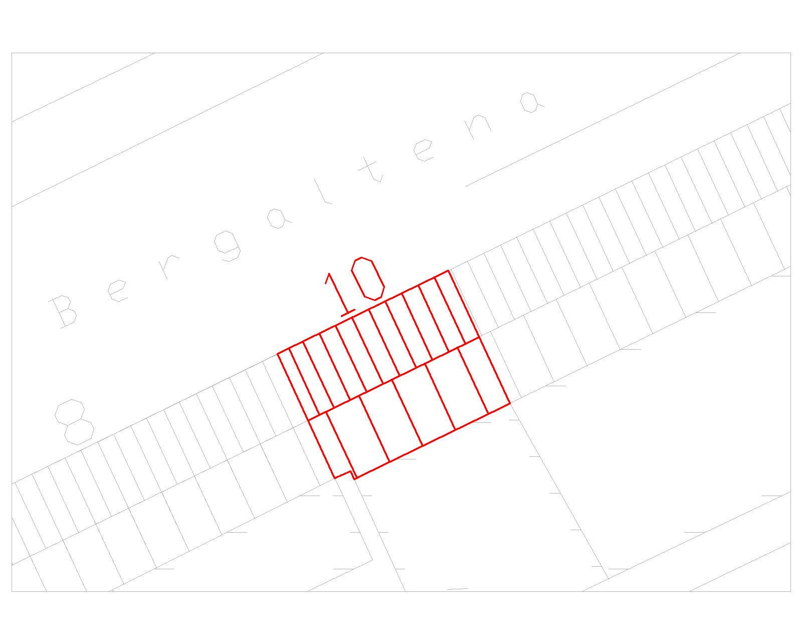 Small one-storey dwelling covered with a gable roof. Part of a set of row-houses along sloping Berg Altena. Front façade with cornice and central door with flanking windows.