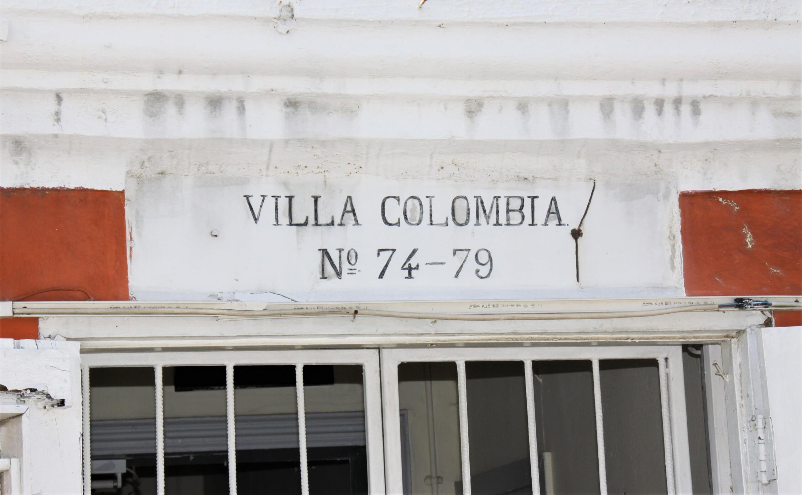De voorgevel (noordgevel) ligt direct aan de straat en is ingedeeld volgens drie assen met een centraal geplaatste paneeldeur met houten shutters en aan weerszijden een staand venster met houten shutterramen. Boven de deur is een marmeren plaquette met de naam en het vroegere huisnummer aangebracht: ‘Villa Colombia/ No. 74-79’. De gevelhoeken zijn afgezet met lisenen en tevens is de gevel uitgevoerd met een gepleisterd basement.