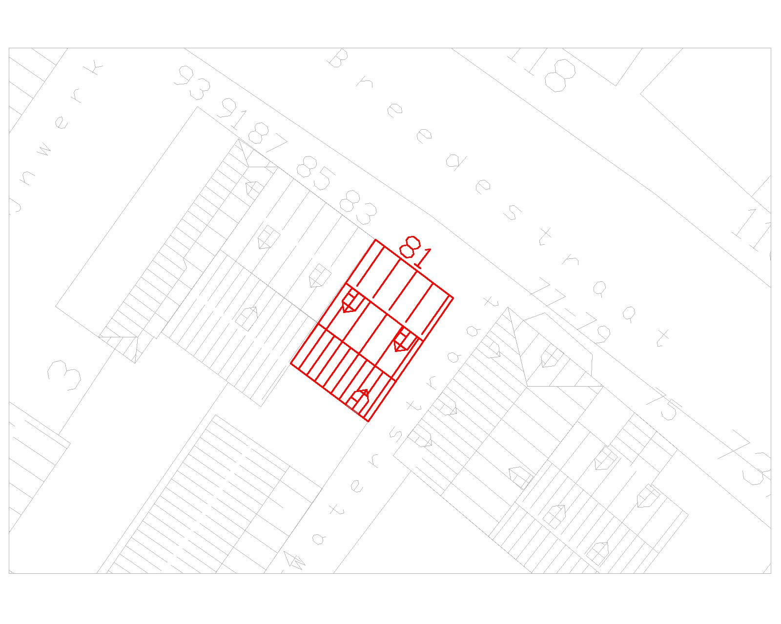 (1) Gezien het feit dat van de westelijke topgevel de profilering naar binnen gericht is, lijkt het alsof de westelijke topgevel tot het naastgelegen pand heeft behoord. Een andere optie is, dat de westelijke gevel van oorsprong een binnen profilering (deklijst) heeft gekregen tegen het hoger opgaande westelijke buurpand.)