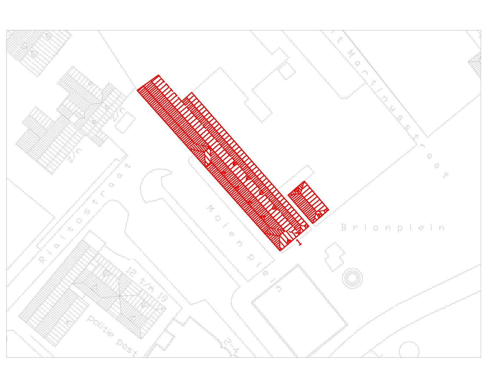 Een langwerpige vleugel op de hoek van het Brionplein en het Molenplein wordt van het boven beschreven pand gescheiden door een smalle gang. De nokken overwegend loodrecht op het Brionplein. Twee bouwlagen met kappen. Twee naast elkaar gelegen schilddaken met de nokken loodrecht op het Brionplein. Boven twee aan de zijde van het Molenplein vooruitspringende paviljoens schilddaken met de nokken evenwijdig aan het Brionplein. Deze dwarse schilddaken sluiten aan op het zuidelijke langgerekte schilddak. Alle daken gedekt met gesmoorde pannen. Op het zuidelijke langgerekte schilddak één dakkapel aan de oostzijde met driehoekig topveld, geprofileerde deklijst en wangstukken, en tweemaal vier dakkapellen respectievelijk aan de noord- en de zuidzijde, met driehoekig topveld met smalle deklijst, geprofileerde zijconsoles, en staande vensters met houten shutterramen.
