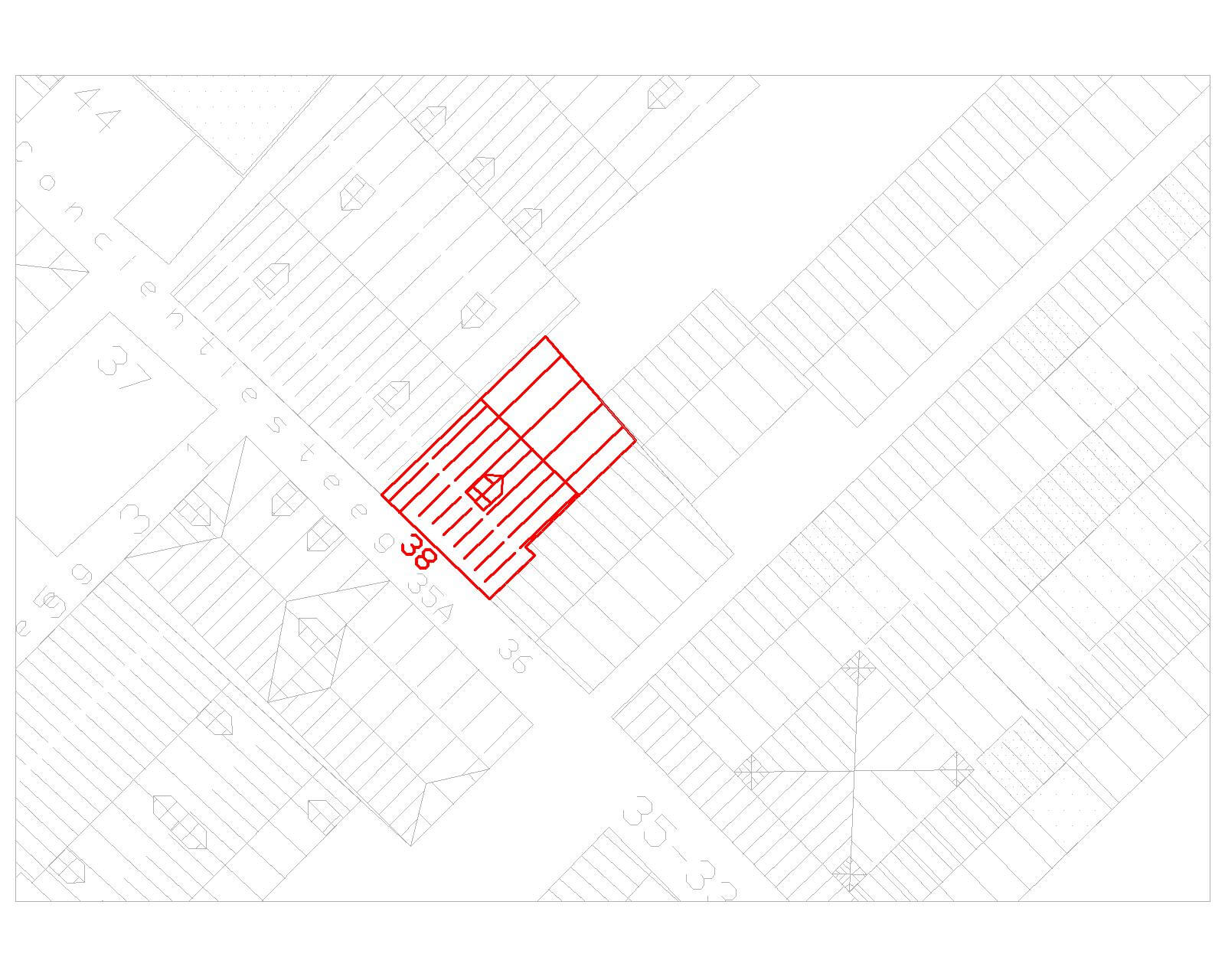 Small structure built against adjoining properties. Ridge parallel to alley. One-and-a-half storey core area covered with a gable roof and front gallery with lean-to roof. Front dormer. Front façade with central door and flanking windows.