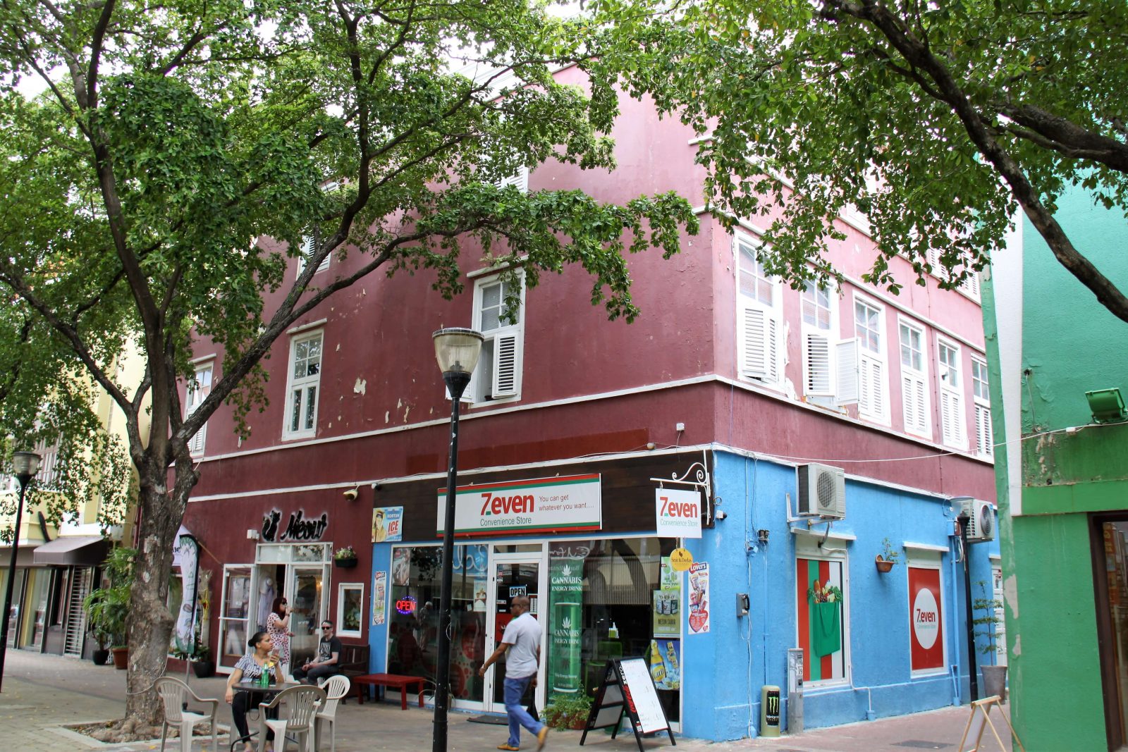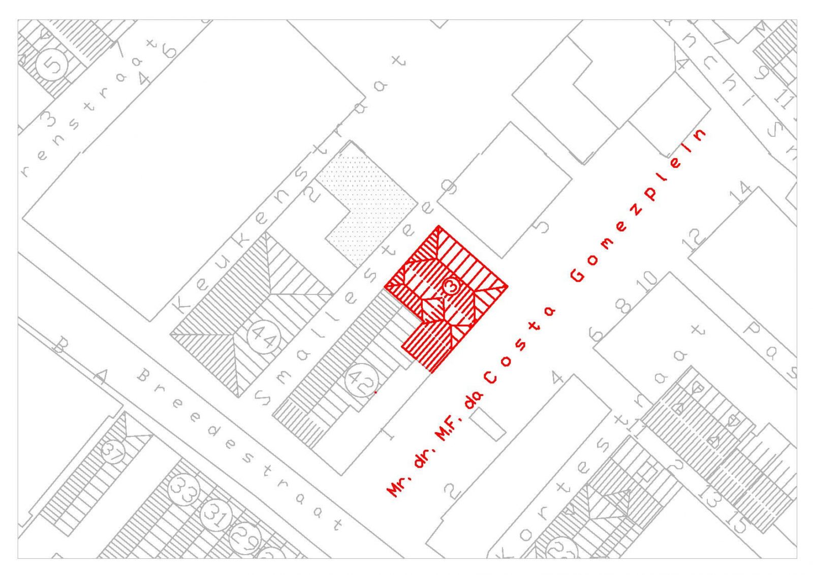“Nagenoeg vrijstaand pand, omsloten door Da Costa Gomezplein, Windstraat en Smallesteeg, met de nokken loodrecht op het Da Costa Gomezplein. Drie bouwlagen met kappen. In totaal drie schilddaken, gedekt met zowel rode verbeterde hollandse pannen alsrode kruispannen, en stenen pirons.