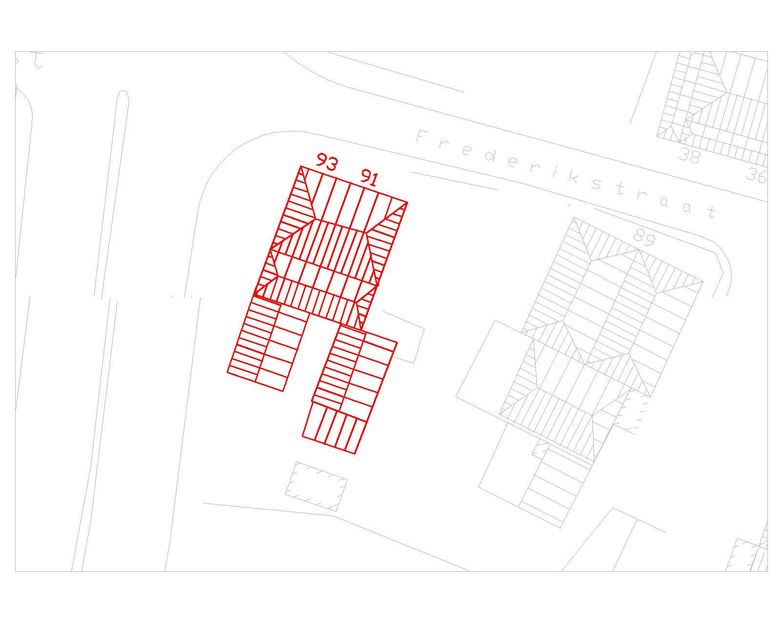 Vrijstaand hoekpand, omsloten door de Frederikstraat en de Arubastraat, met de nokken evenwijdig aan de Frederikstraat. Twee bouwlagen met kappen. Twee naast elkaar gelegen schilddaken met stenen nokken en hoekkepers. Het voorste schilddak is gedekt met grijze kruispannen en het achterste, lagere, schilddak is gedeeltelijk met grijze en gedeeltelijk met rode kruispannen gedekt.