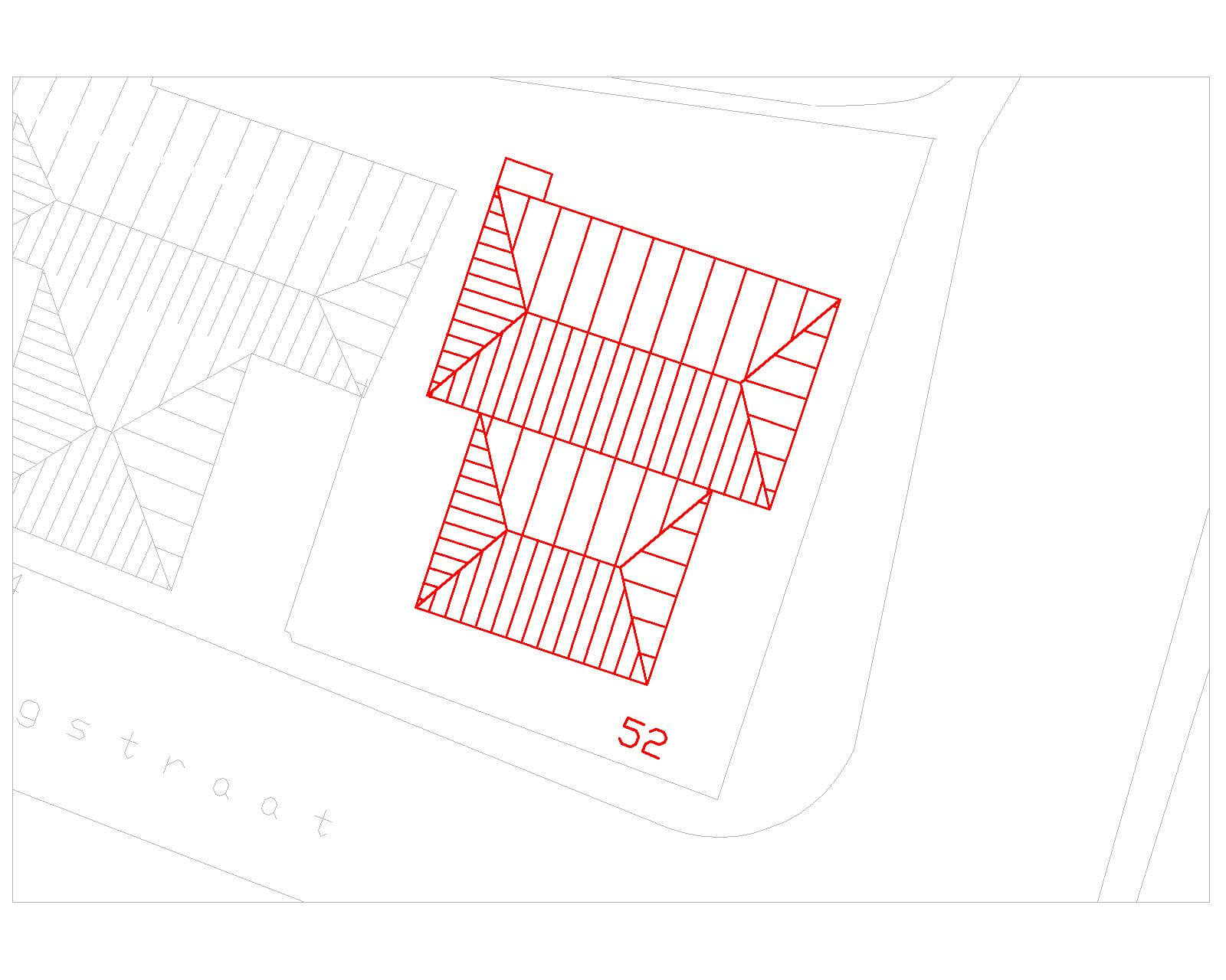 “Vrijstaand pand met de nokken evenwijdig aan de Hoogstraat, opgetrokken over één bouwlaag en kap. Het huis heeft twee evenwijdig achter elkaar liggende schilddaken van verschillende grootte, die gedekt zijn met rode kruispannen en zijn voorzien van stenen nok en hoekkepers.