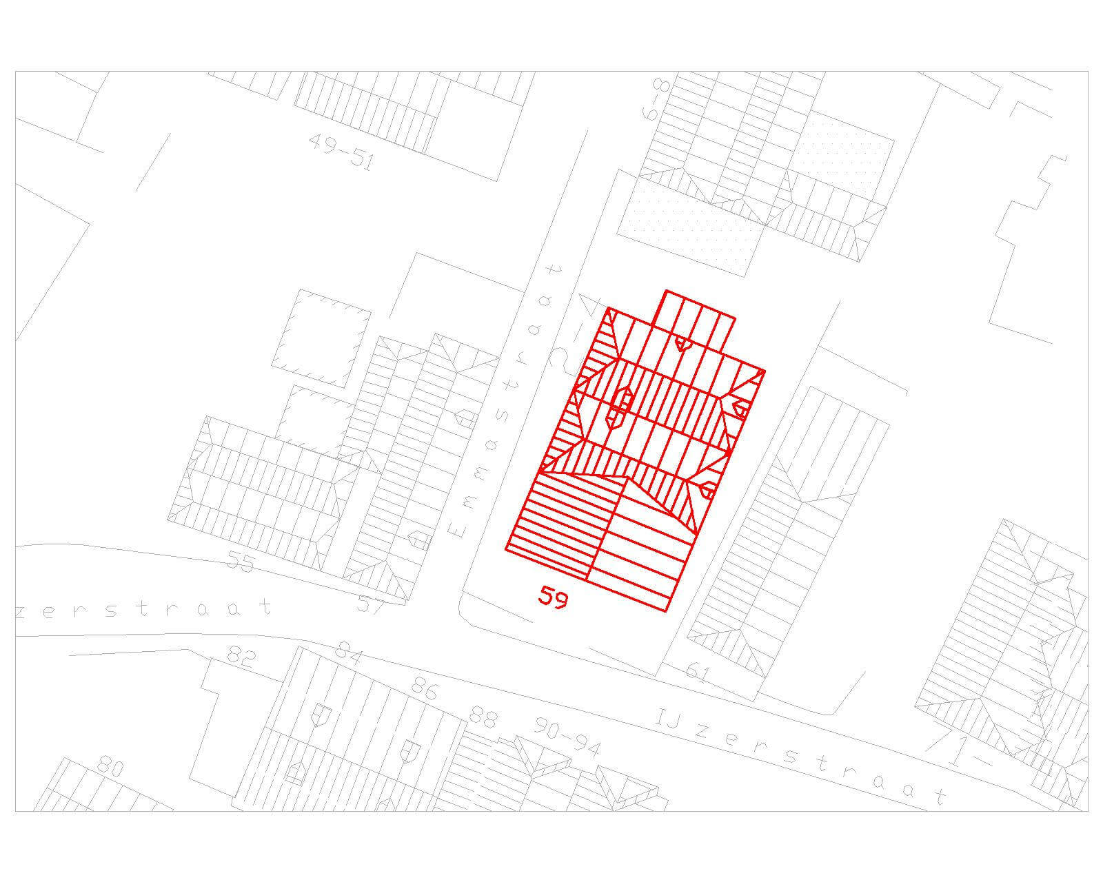 “Vrijstaand hoekpand omsloten door IJzerstaat en Emmastraat met de nokken hoofdzakelijk in oostwestrichting. Twee bouwlagen met kap. Het grootste deel van het gebouw wordt gedekt door twee naast elkaar gelegen schilddaken met pirons. Boven het voorste deel van het pand sluit een zadeldak hier loodrecht op aan. Rode oudhollandse pannen. Beide schilddaken hebben aan de oostzijde één dakkapel, het achterste schilddak heeft aan de noordzijde nog een dakkapel. De dakkapellen hebben een driehoekig topveld.