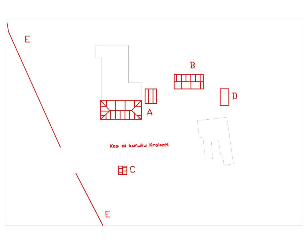 - B) Op korte afstand ten oosten van het kunuku-huis staat een bijgebouwtje (magasina ?) op een rechthoekige plattegrond. Het is opgetrokken over een bouwlaag plus kap. (2) De kap is afgedekt met metalen golfplaat en heeft een overstek. De muren zijn opgebouwd uit een raamwerk van hout bestaande uit staanders en vlechtwerk. Op het raamwerk van hout is zowel aan de binnen als de buitenzijde een laag van leem en koemest aangebracht. Aan de zuidzijde is een opening met een opgeklampte houten deur. De deur is geheel in de rechts in de gevelwand geplaatst. In de korte westelijke gevel is in het midden een kleine opening boven in de wand.
