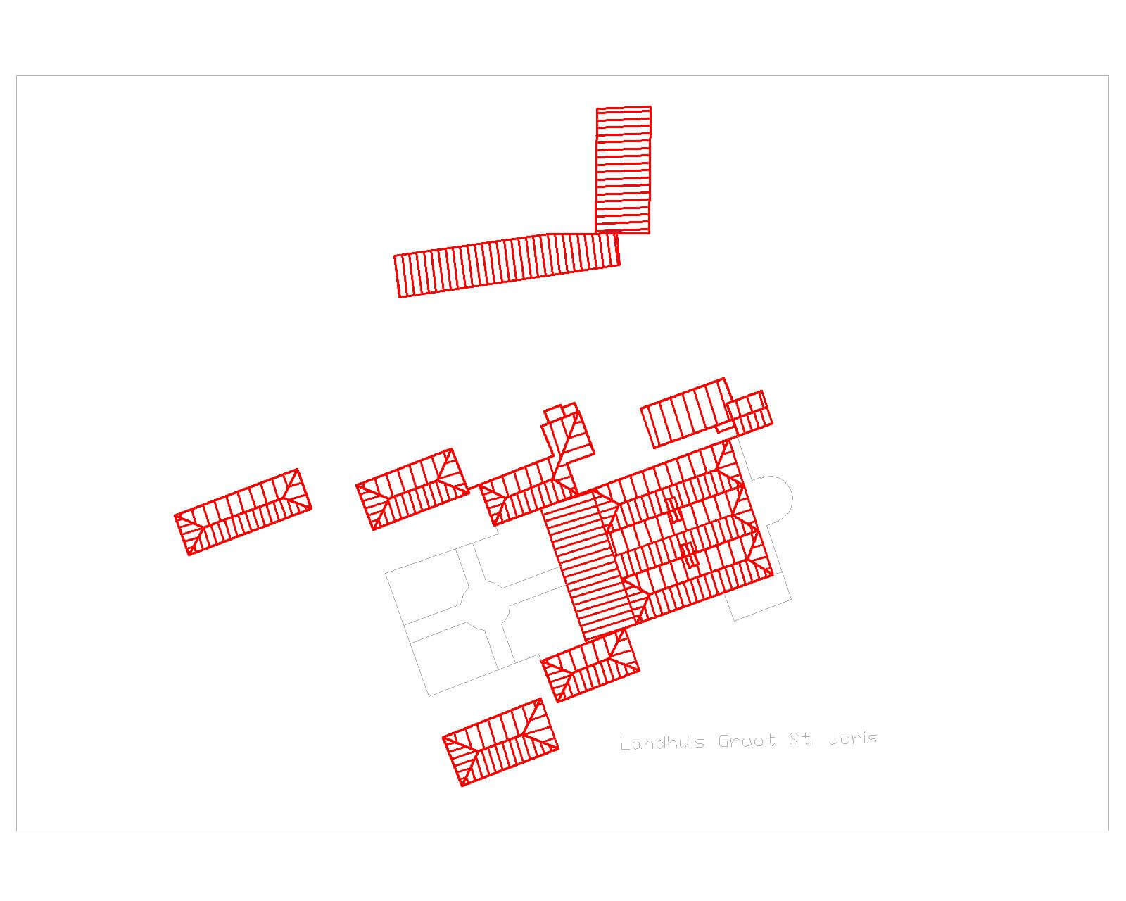 - E) Noordelijk een woning op rechthoekige plattegrond van een enkele bouwlaag en schilddak (golfplaatdekking).
