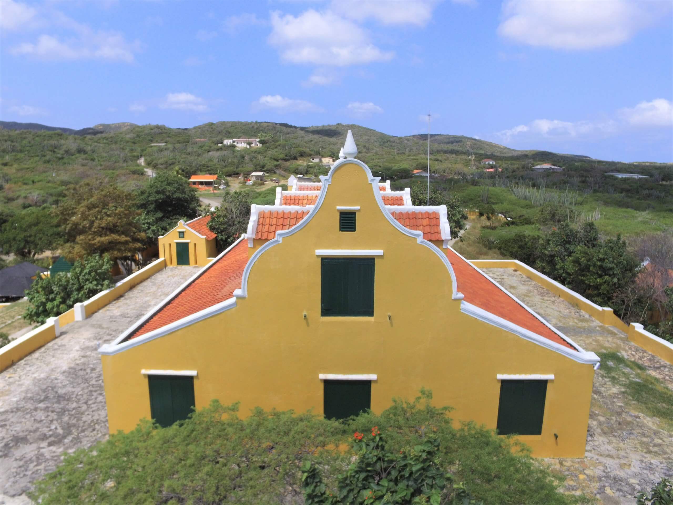 One of the oldest and largest plantations on the island with a comprehensive well-preserved set of facilities. Main building rebuilt in 18th century style. One storey structure with rectangular floor plan laid out on elevated platform. Core area and flanking galleries. Gable roof with dormers over core area, adjoining slant roofs over galleries. Terrace on all four sides. Plantation facilities include a.o. magasina’s, stables, corrals, dairy and milling house, forge, threshing floor, cistern and remnants of the former slave settlement. Also a hofi with wells, pos di pia, water reservoirs, water dams and canals.
