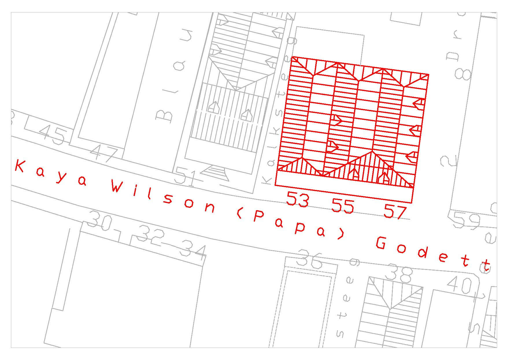 “Complex van drie aaneengebouwde panden tussen Pietermaaiweg, Kalksteeg en Draaiweg met de hoofdnokken loodrecht op de Pietermaaiweg. Waarschijnlijk kwamen de panden Pietermaaiweg 53 en 55-57 in aanleg vrijwel overeen, maar in huidige situatie heeft nr. 53 een bovenverdieping. Beide delen worden apart beschreven.