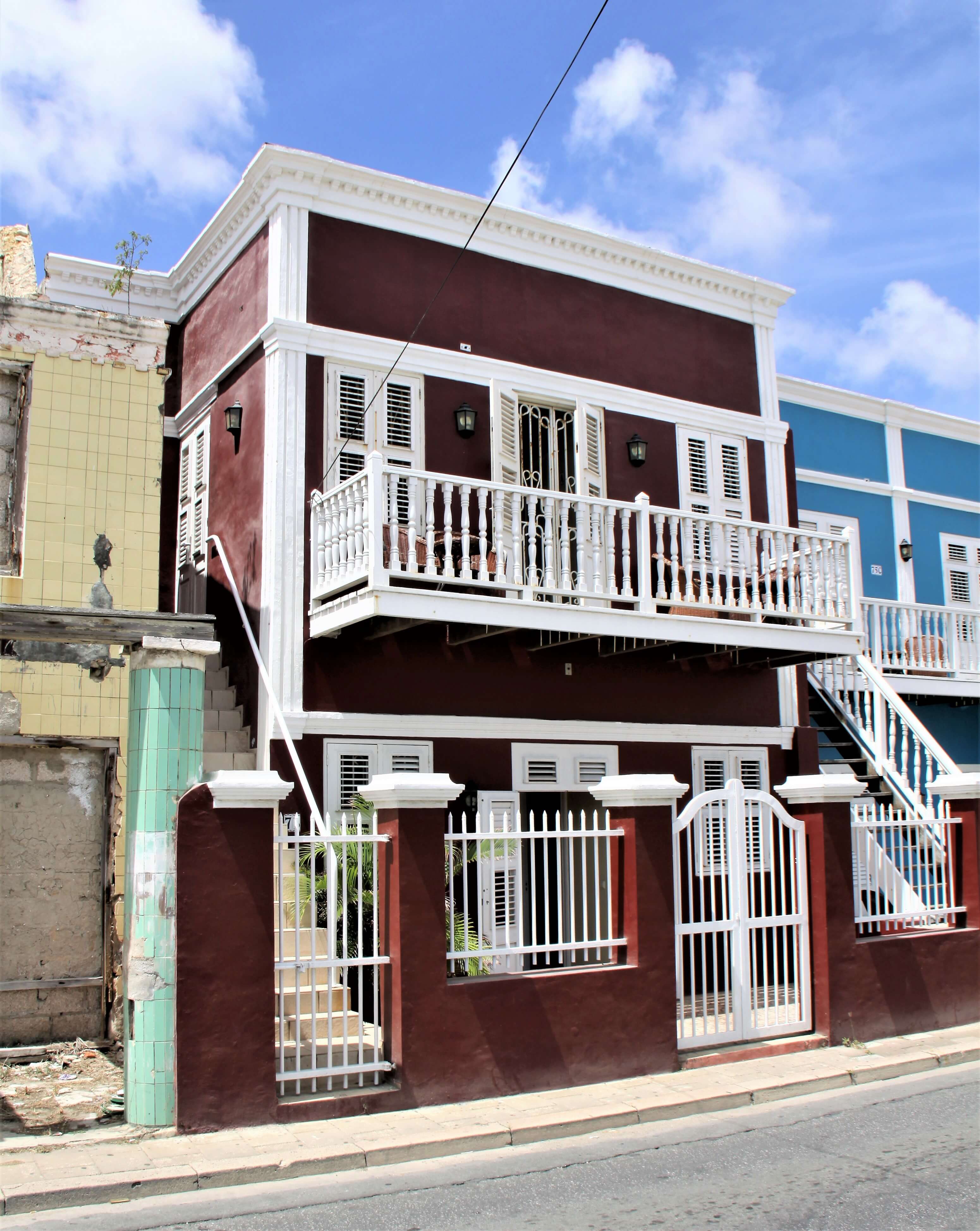 Two-storey structure built against adjacent properties. Flat roof. Front section with small setback sections at corners accommodating two staircases (right one belongs to adjacent property). Projecting cornice with dentils over exposed façades and fluted pilasters on corners. Front façade with central door and flanking windows on ground and first floor. Weather mouldings above openings continued as horizontal bands. Almost full-frontage front balcony.