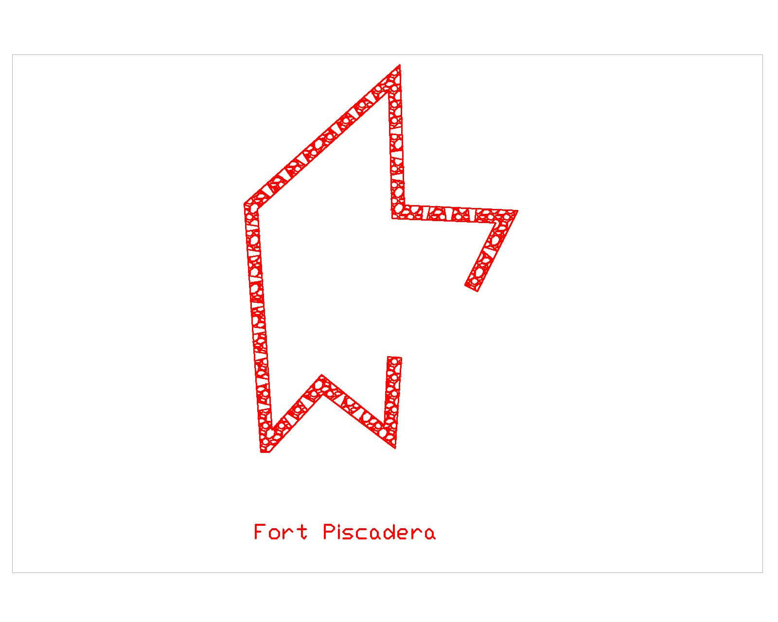 Battery facing the entrance of Piscaderabaai. Plain arrow- shaped design open at rear side. Platform with shooting gallery and a powder house. Barracks at unprotected rear flank. Plastered stone walls with sloping top end.