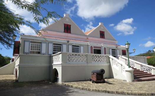 De voorgevel (zuidwestgevel) heeft een centraal gelegen portiek met dubbele houten paneeldeuren. De dwarsmuur aan de linkerzijde van de portiek heeft een venster. In de gevelwand aan weerzijden van de portiek zit een vensteropening met houten shutterramen. Voor de voorgevel staan vier vierkant kolommen waarop een luifel rust (2). Op de middelste twee kolommen zitten vlaggenmasten.