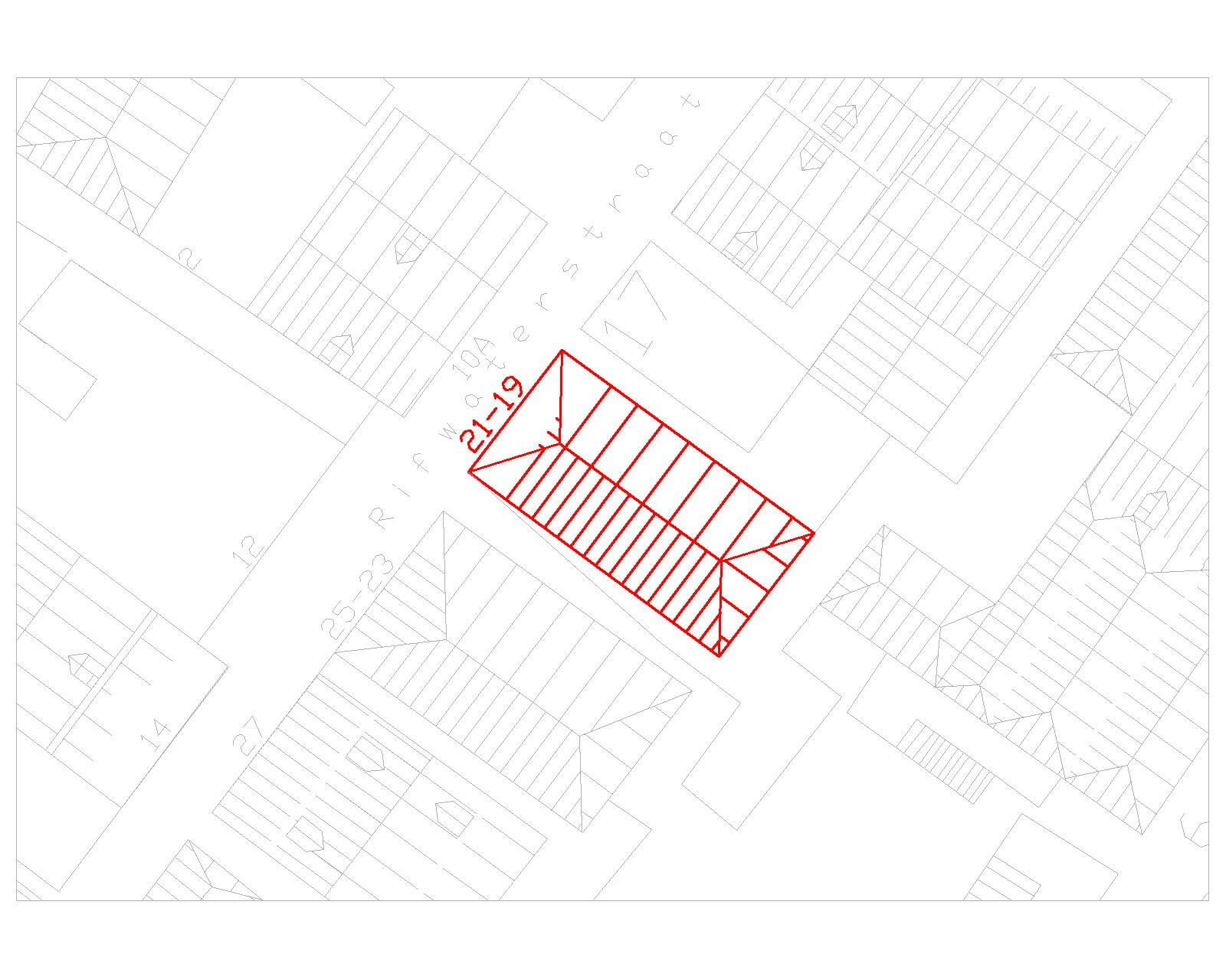Detached two-storey structure ranging with alley. Twin structure of nr. 23-25. Rectangular floor plan covered with hipped roof. Two-band cornice over façades with typical corner ornaments. Front façade laid out in three vertical axes with shutter windows on first floor and central door and flanking windows on ground floor. Gate access to rear yard on both sides of structure.
