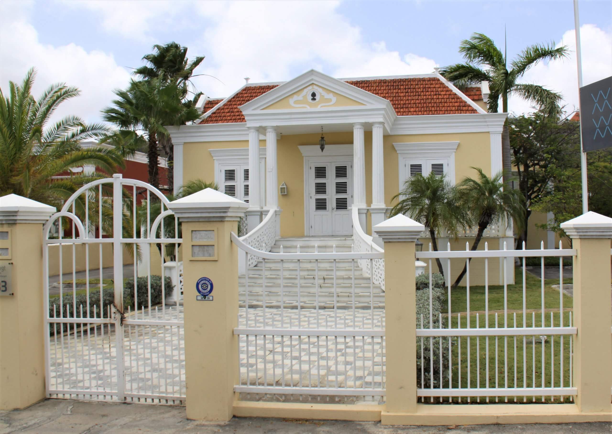 Gevels: gepleisterde en geverfde gevels. Alle deuren zijn houten shutterpaneeldeuren en alle vensters hebben houten shutterramen. In de onderverdieping vierkante openingen in de zijgevels, voorzien van opgeklampte houten luiken.