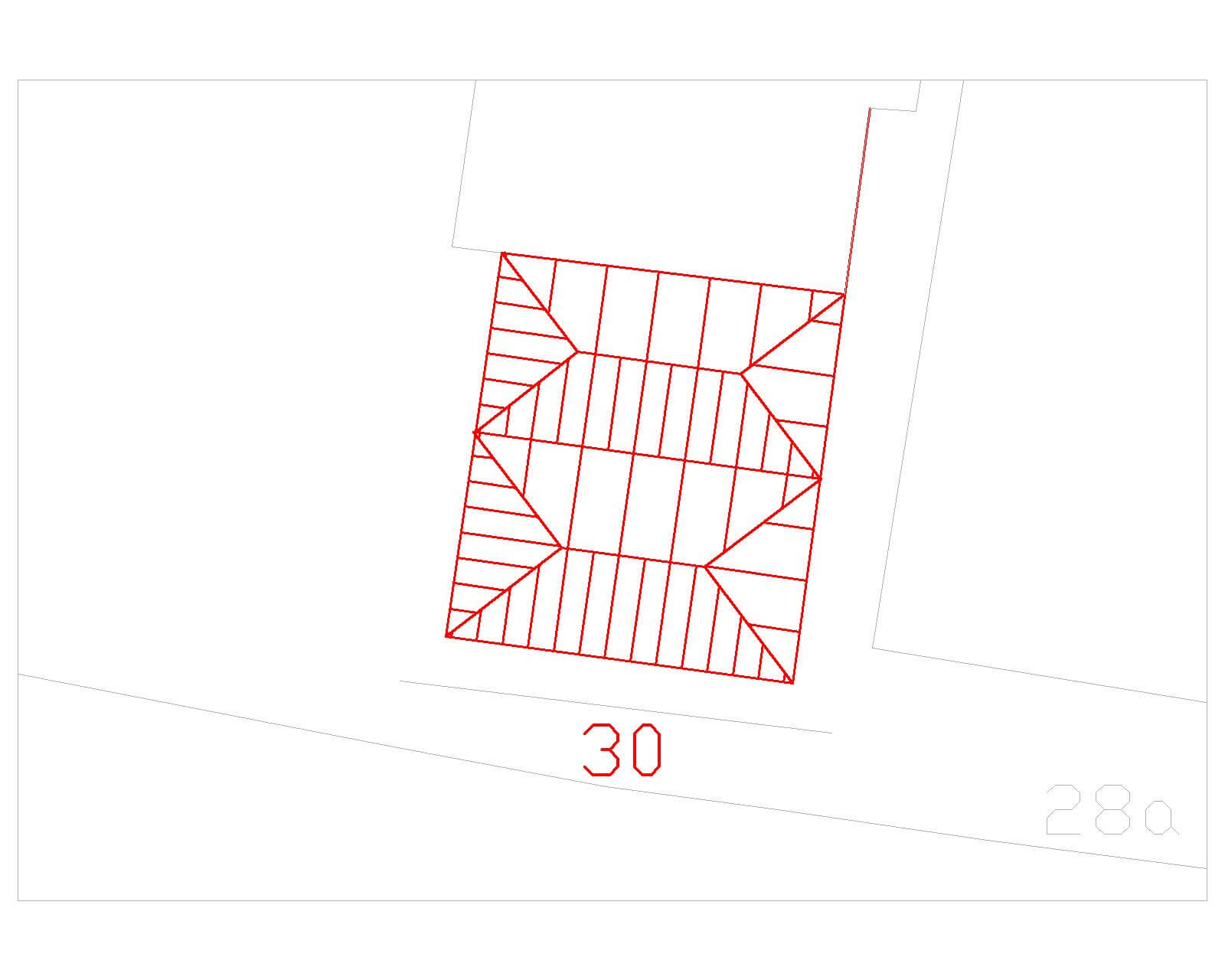 Small detached one-storey structure with ridges parallel to street. Two hipped roofs with cement hips over rectangular floor plan. Small cornice over front and wider cornice over side façades. Front façade with two doors and one windows. Full-frontage short front terrace with stairs on one end.